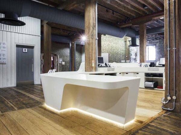 Quầy lễ tân có màu trắng sáng, độ bền và đẹp, cùng với khả năng xuyên sáng cao sẽ gây ấn tượng vào mọi thời điểm trong ngày.