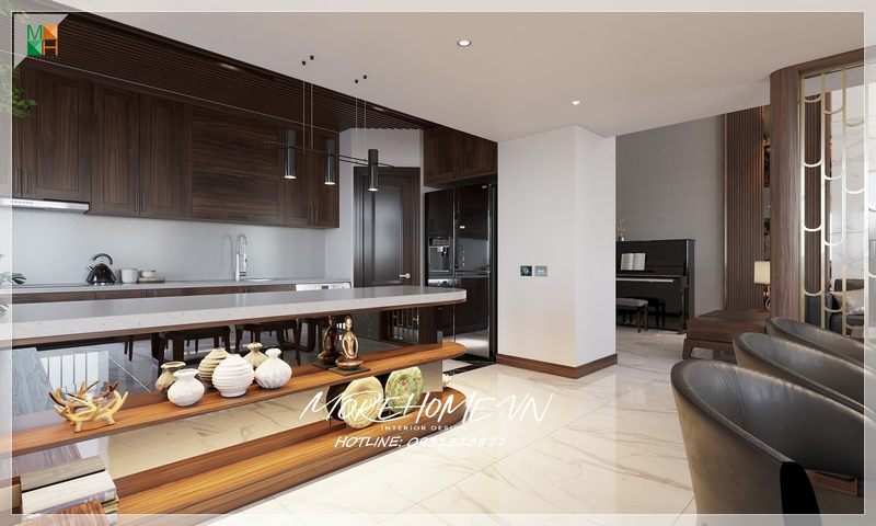 Mẫu thiết kế bàn đảo bếp bằng gỗ kết hợp với mặt đá nhân tạo độc đáo sẽ làm nổi bật không gian, tạo điểm nhấn và ngăn cách khu vực bếp và phòng ăn.
